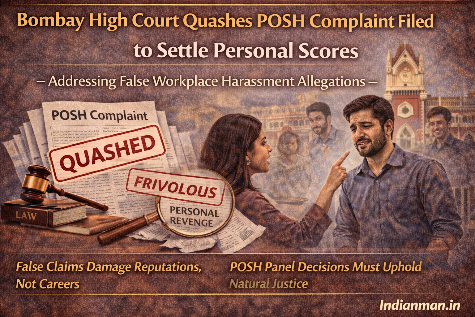 Strong SEO keywords include POSH Act misuse India, Bombay High Court POSH quashed, false workplace harassment complaint, men rights POSH law, corporate harassment legal news.